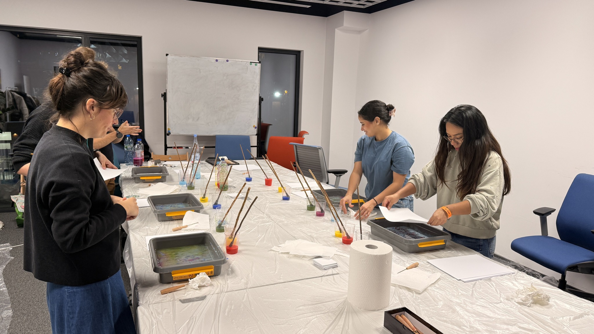 ✨ На Open Community Evening ми навчалися малювати на воді технікою Ебру, створюючи справжні маленькі витвори мистецтва. Водночас відбувався English Speaking Club у хэлловінському форматі, а також семінар докторки Наташі Блут про переживання українських мігранток.