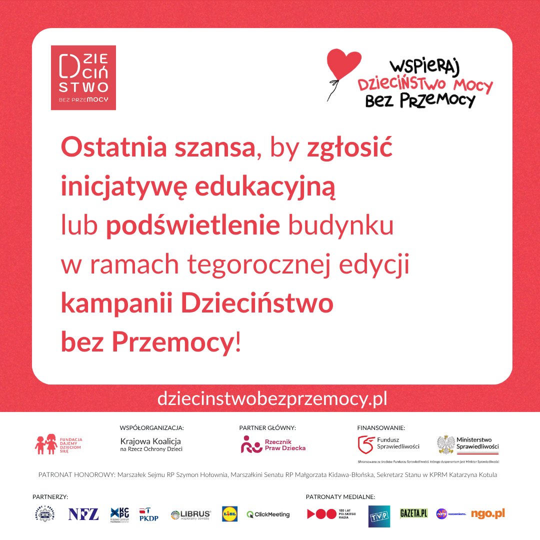 19 listopada finał kampanii Dzieciństwo bez Przemocy! To ostatnia szansa, by zgłosić inicjatywę edukacyjną lub podświetlenie budynku w ramach ogólnopolskich działań: dziecinstwobezprzemocy.pl/jak-dolaczyc-2025
