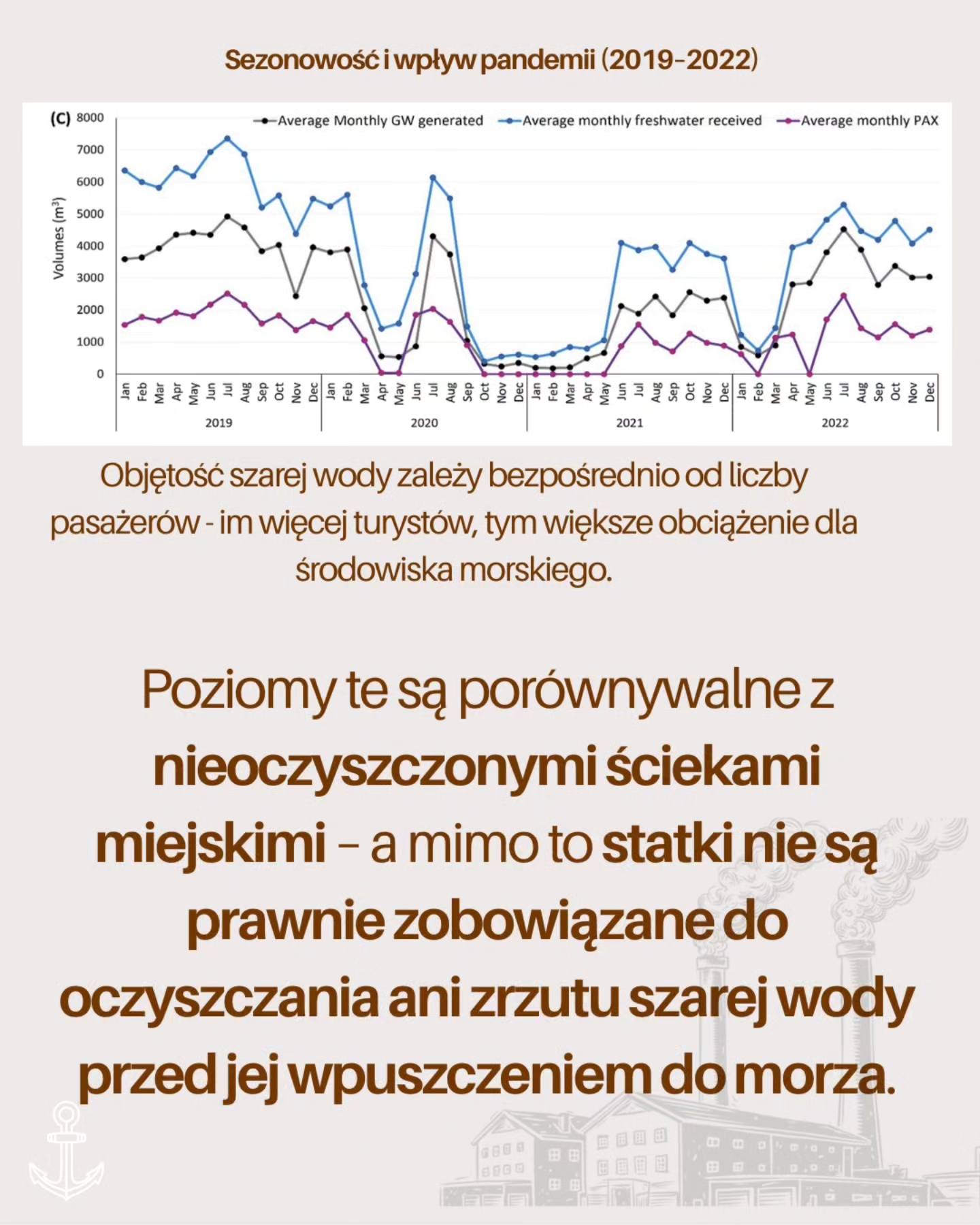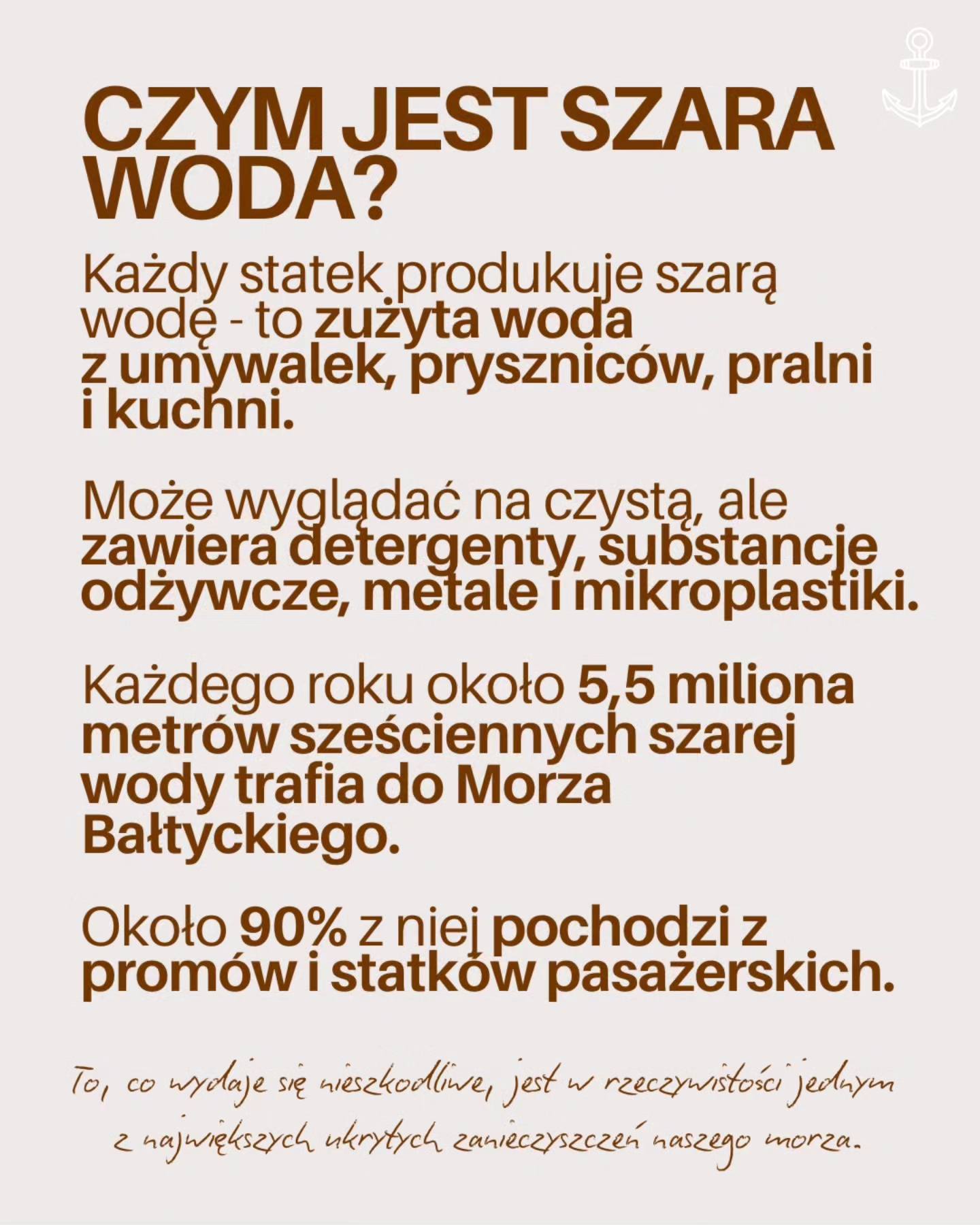 To szara woda, czyli zużyta woda z pryszniców, umywalek, pralni i kuchni. Wydaje się czysta, ale zawiera detergenty, substancje odżywcze, metale ciężkie, leki i mikroplastiki. Każdego roku do Morza Bałtyckiego trafia około 5,5 miliona metrów sześciennych takiej wody, z czego 90% pochodzi z promów i statków pasażerskich.