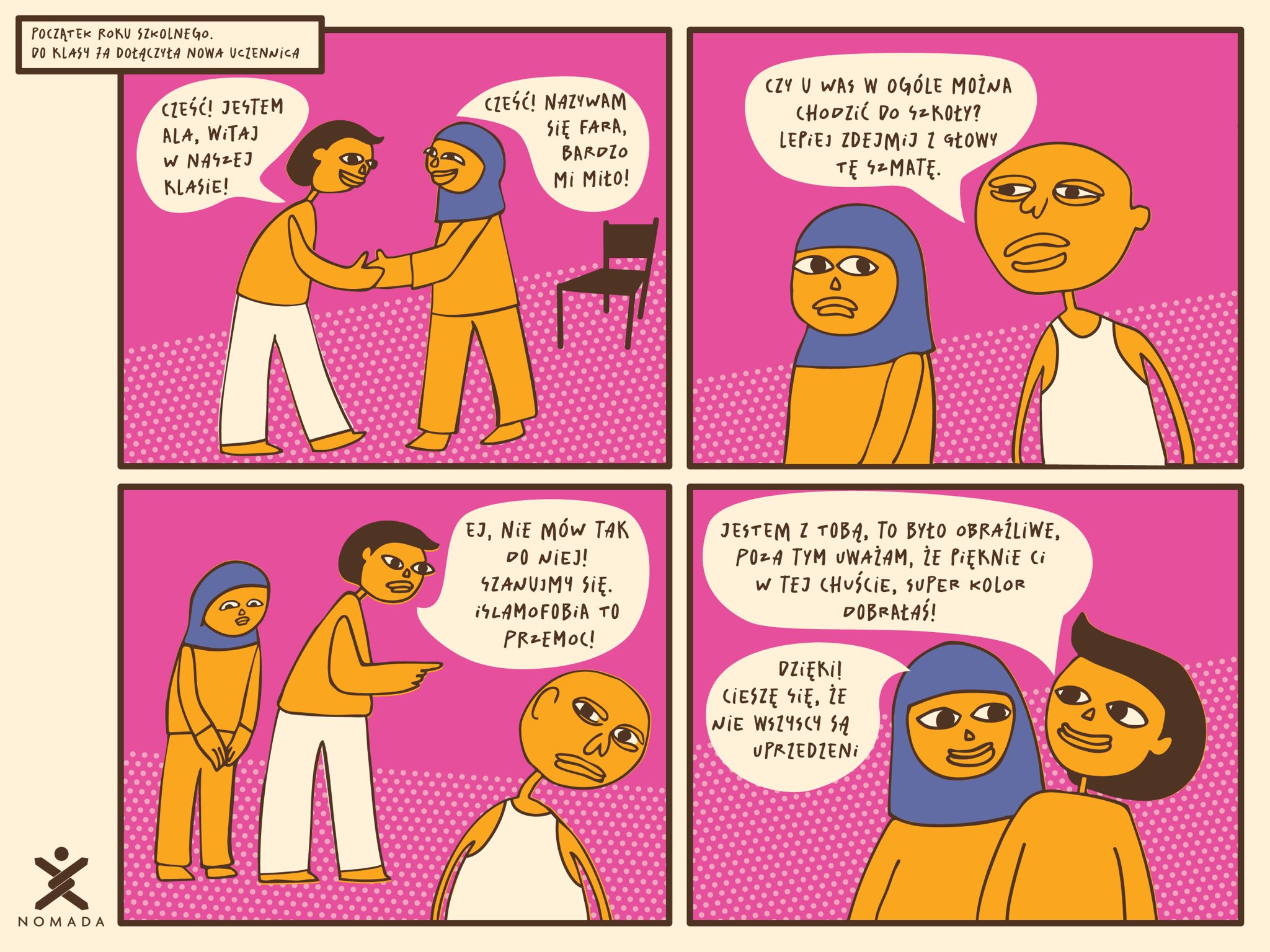 Islamofobiczne docinki w szkole? Możesz to zatrzymać. Powiedz spokojnie i stanowczo: „Hej, uszanuj jej/ich wiarę i wybór.”