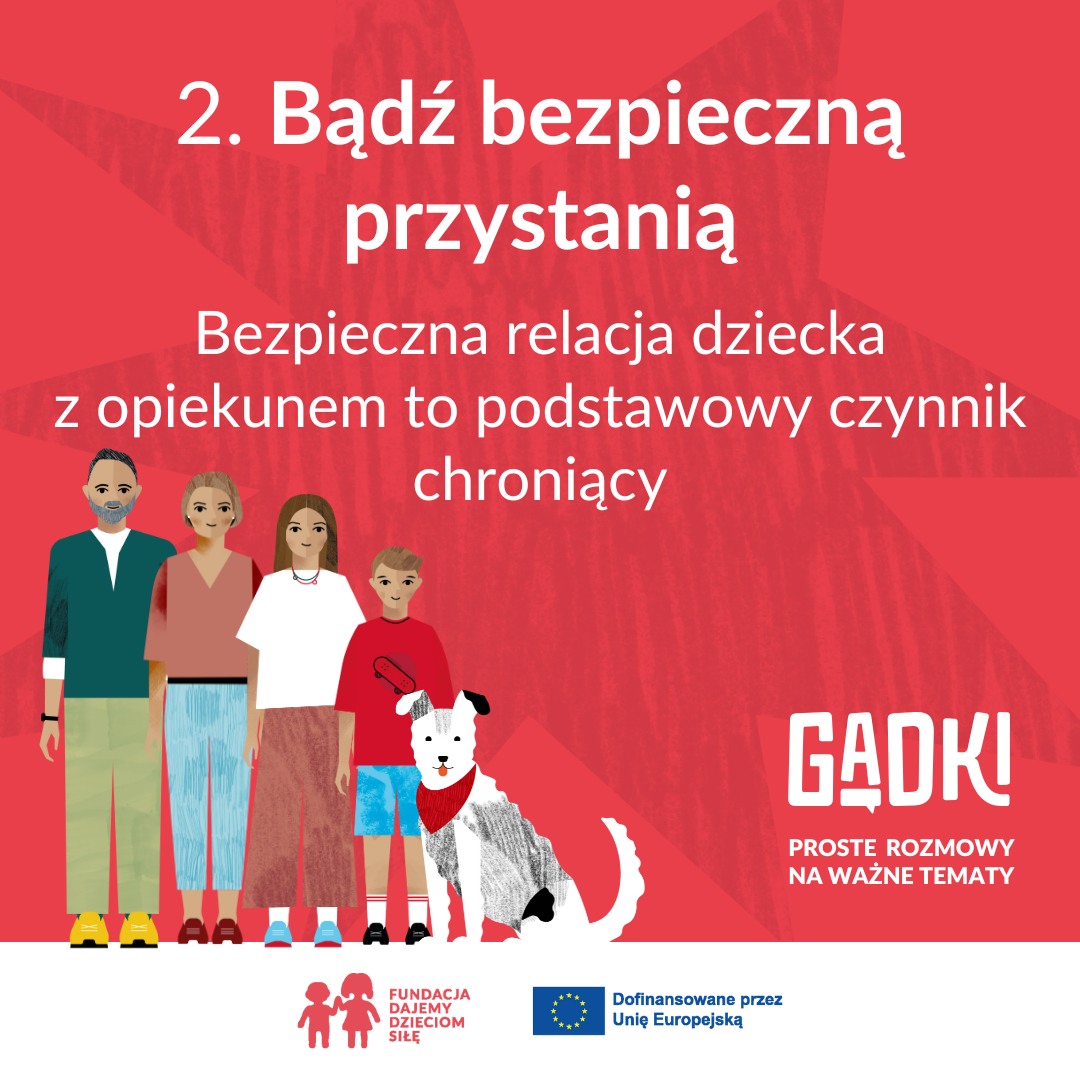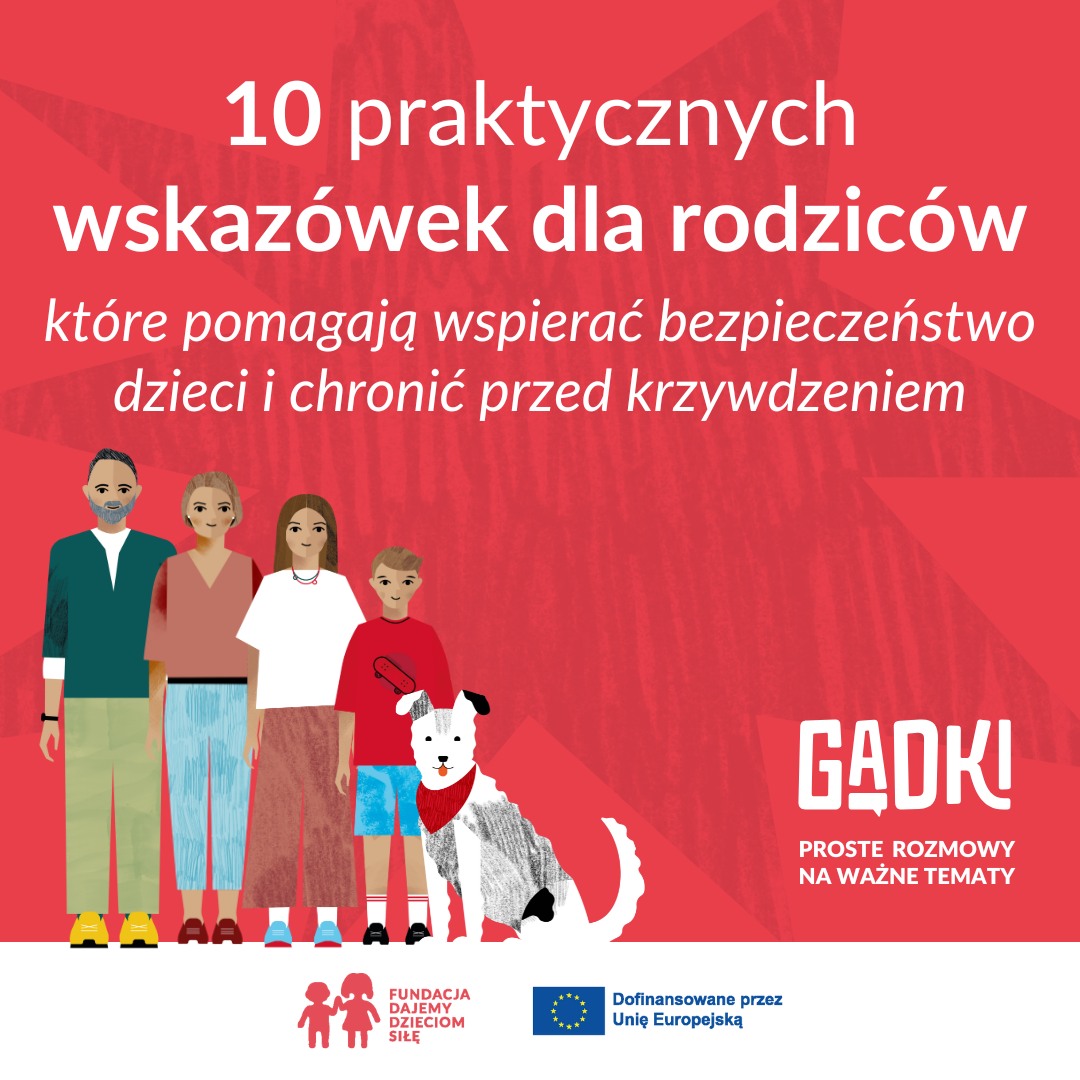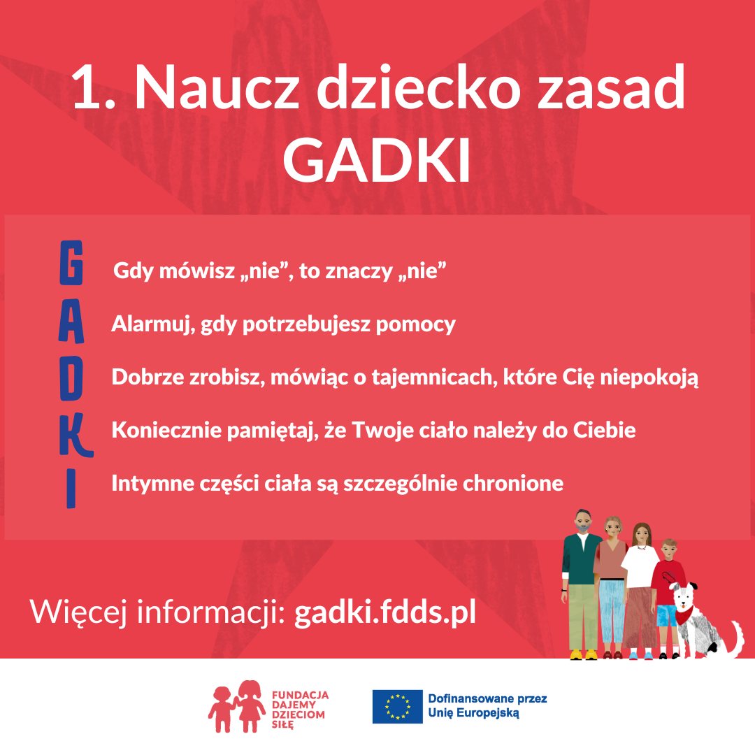 Rozmawiaj o ciele, granicach i bezpieczeństwie w sposób dostosowany do wieku. Wykorzystaj materiały GADKI dostępne na stronie gadki.fdds.pl i konsultacje z telefonem dla dorosłych w sprawie bezpieczeństwa dzieci 800 100 100