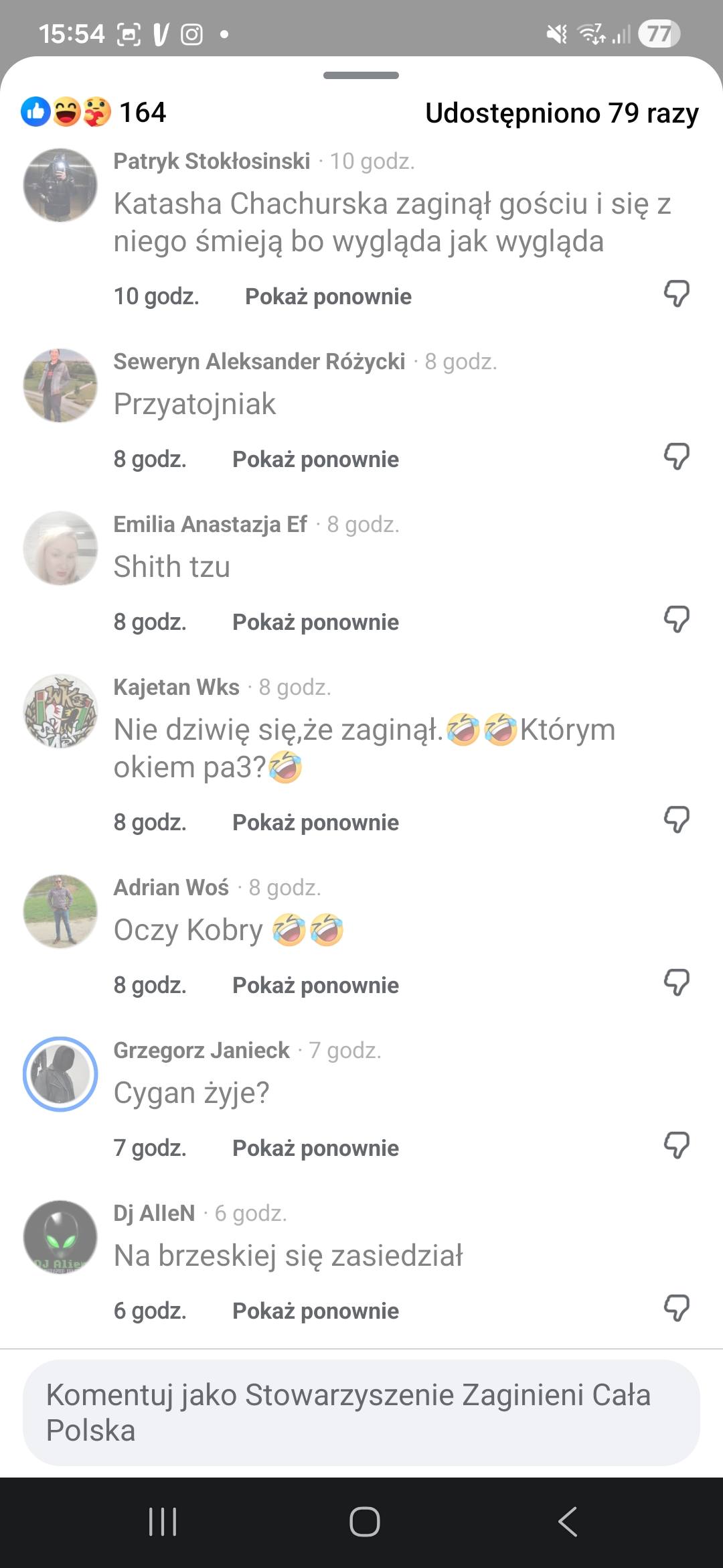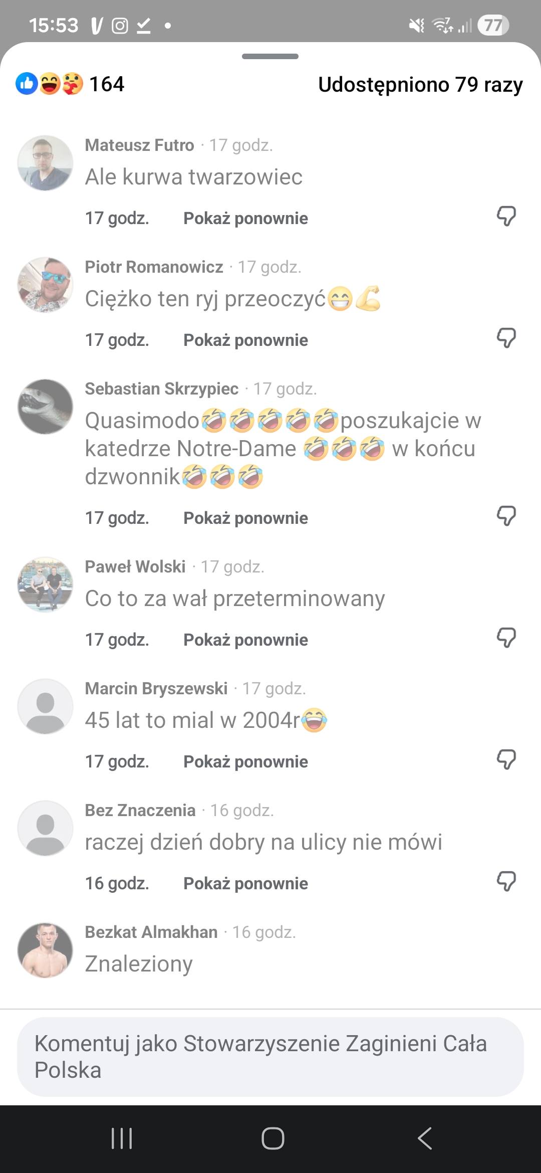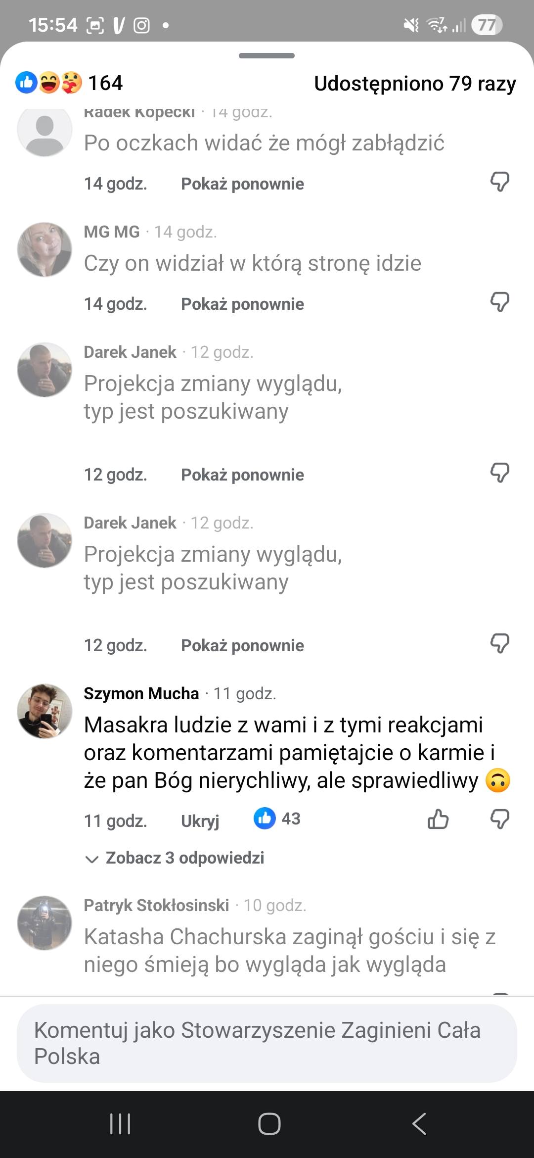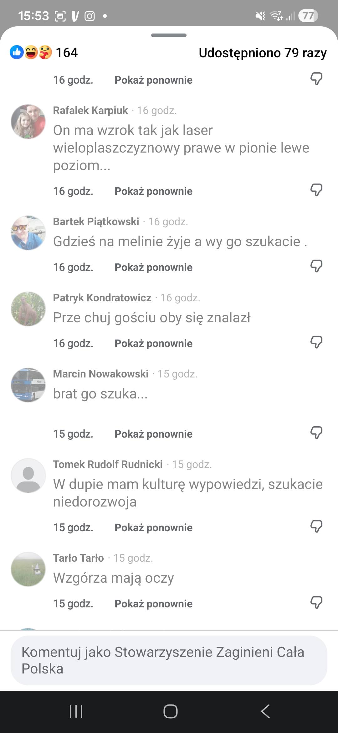 Długo myślałyśmy czy zakryć dane osób, które wstawiły te komentarze pod postem zaginionego. Ale przecież te komenatrze zostały dane przez Was publicznie na naszej stronie. Na waszych profilach można zobaczyć zdjęcia z rodzinami z dziećmi, informacje gdzie pracujecie, gdzie studiujecie. Mam nadzieję, że wstydzcie się teraz za swoje zachowanie. Komentarze pod postem zaginionego są ukryte z szacunku do jego rodziny.