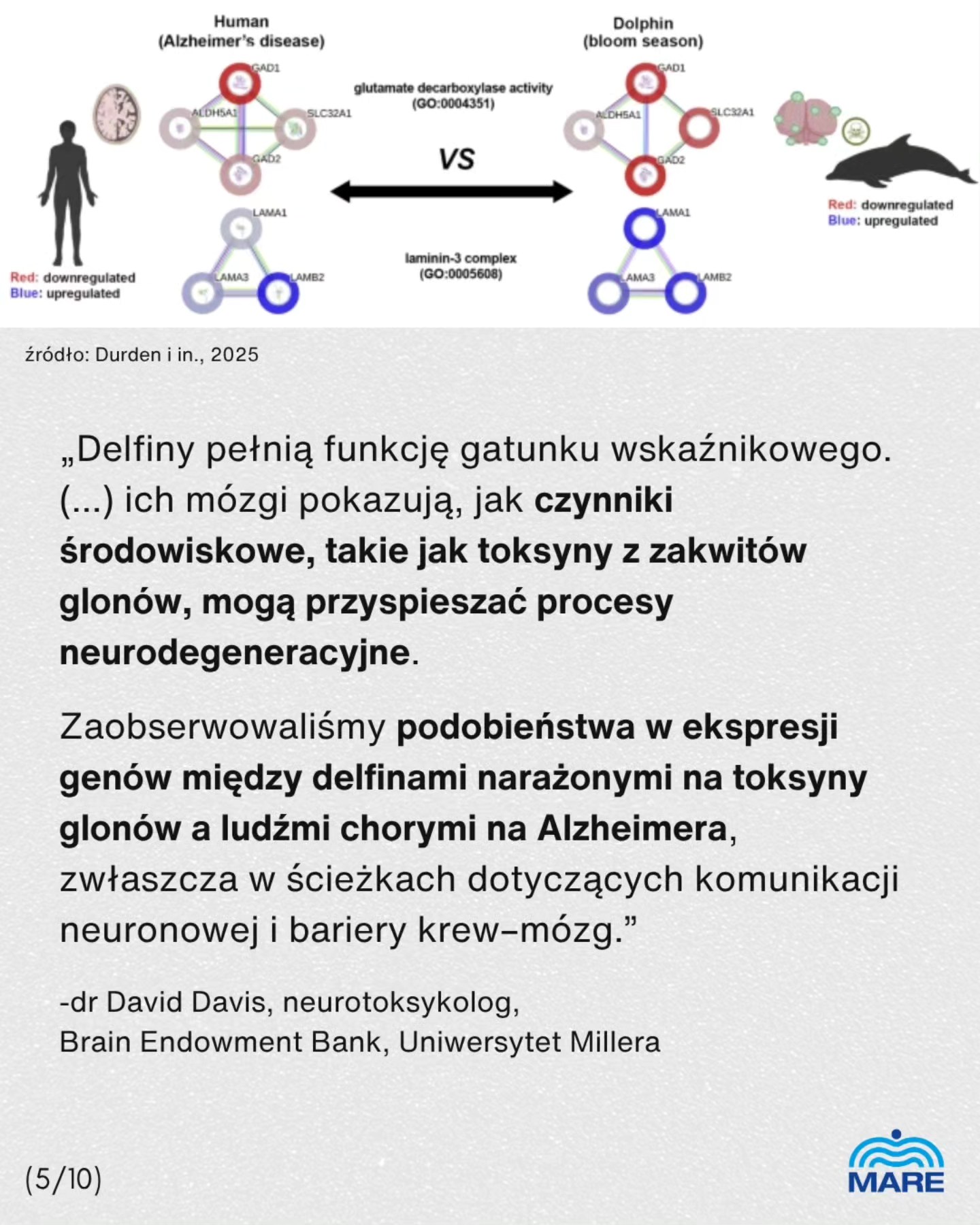 Najnowsze badania wskazują także, że w ich mózgach, pod wpływem toksyn pochodzących z zakwitów glonów (ang. harmful algal blooms, HABs) mogą wykształcać się zmiany podobne do choroby Alzheimera u ludzi.