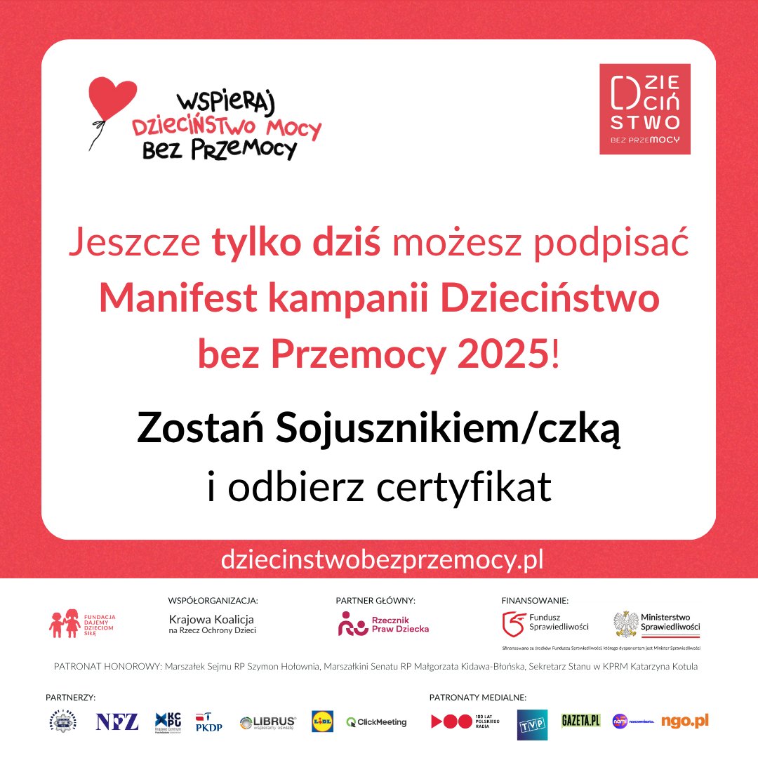 Ostatni dzień, by zostać Sojusznikiem/Sojuszniczką kampanii Dzieciństwo bez Przemocy 2025! Wystarczy podpisać Manifest na stronie manifest.fdds.pl