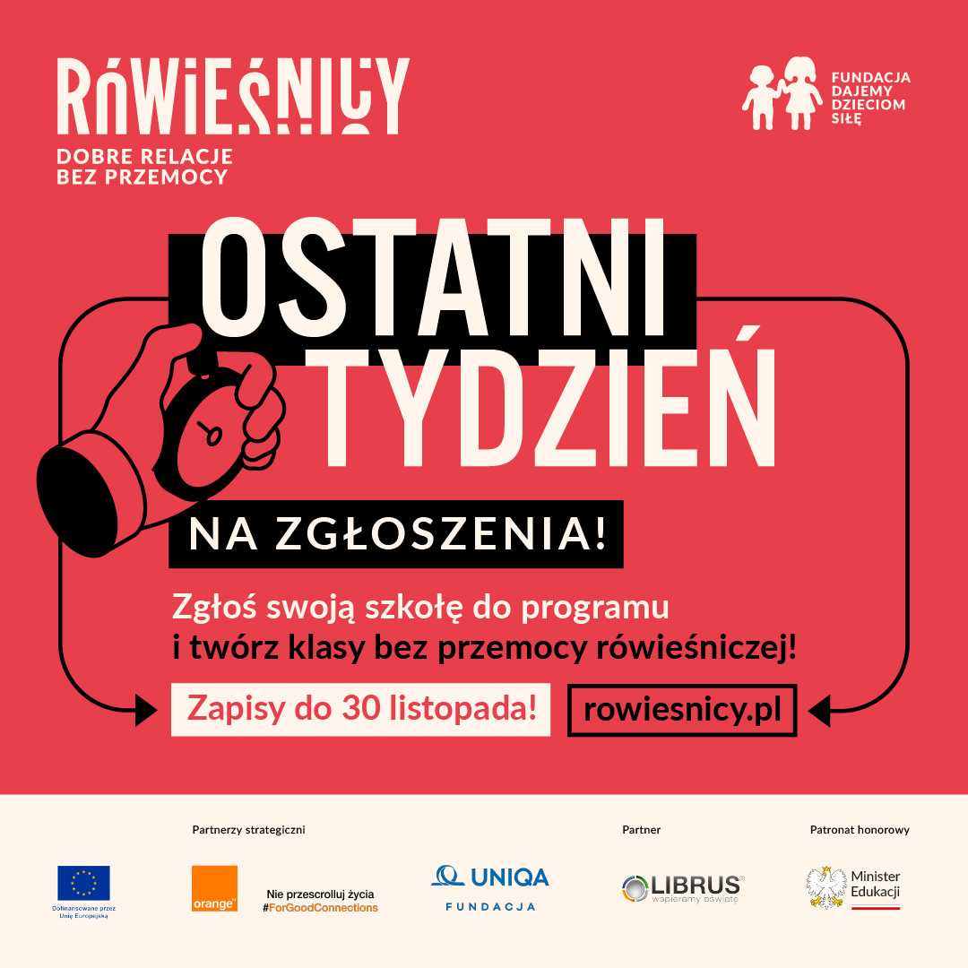 OSTATNI TYDZIEŃ NA ZGŁOSZENIA Program RÓWIEŚNICY ruszył już 5 listopada i prawie 4000 szkół w całej Polsce zaczęło działać