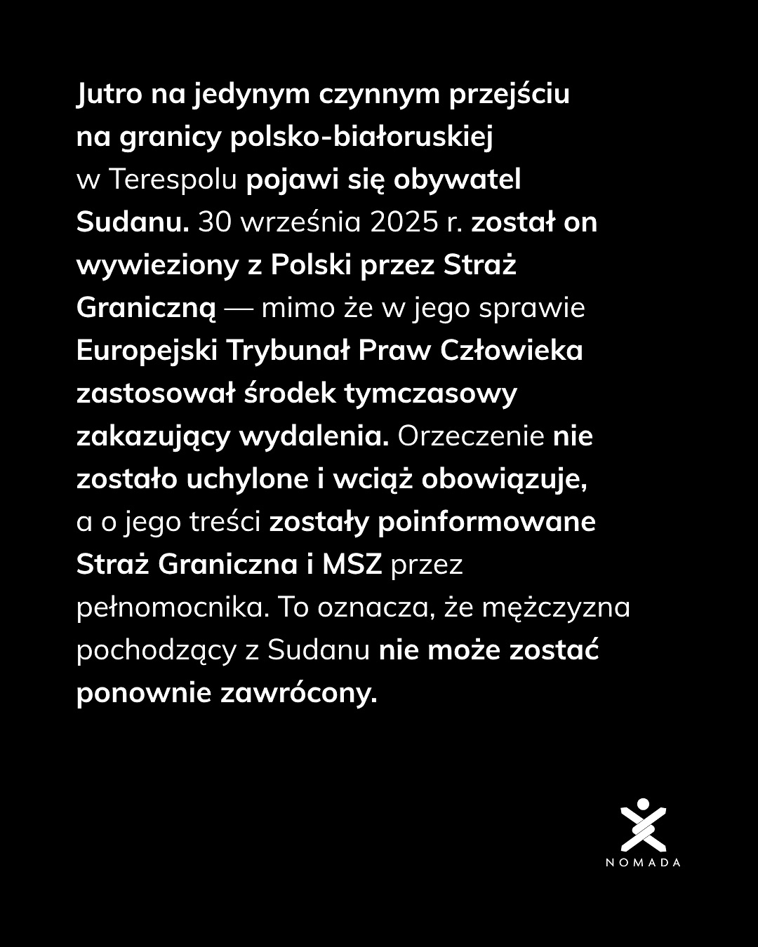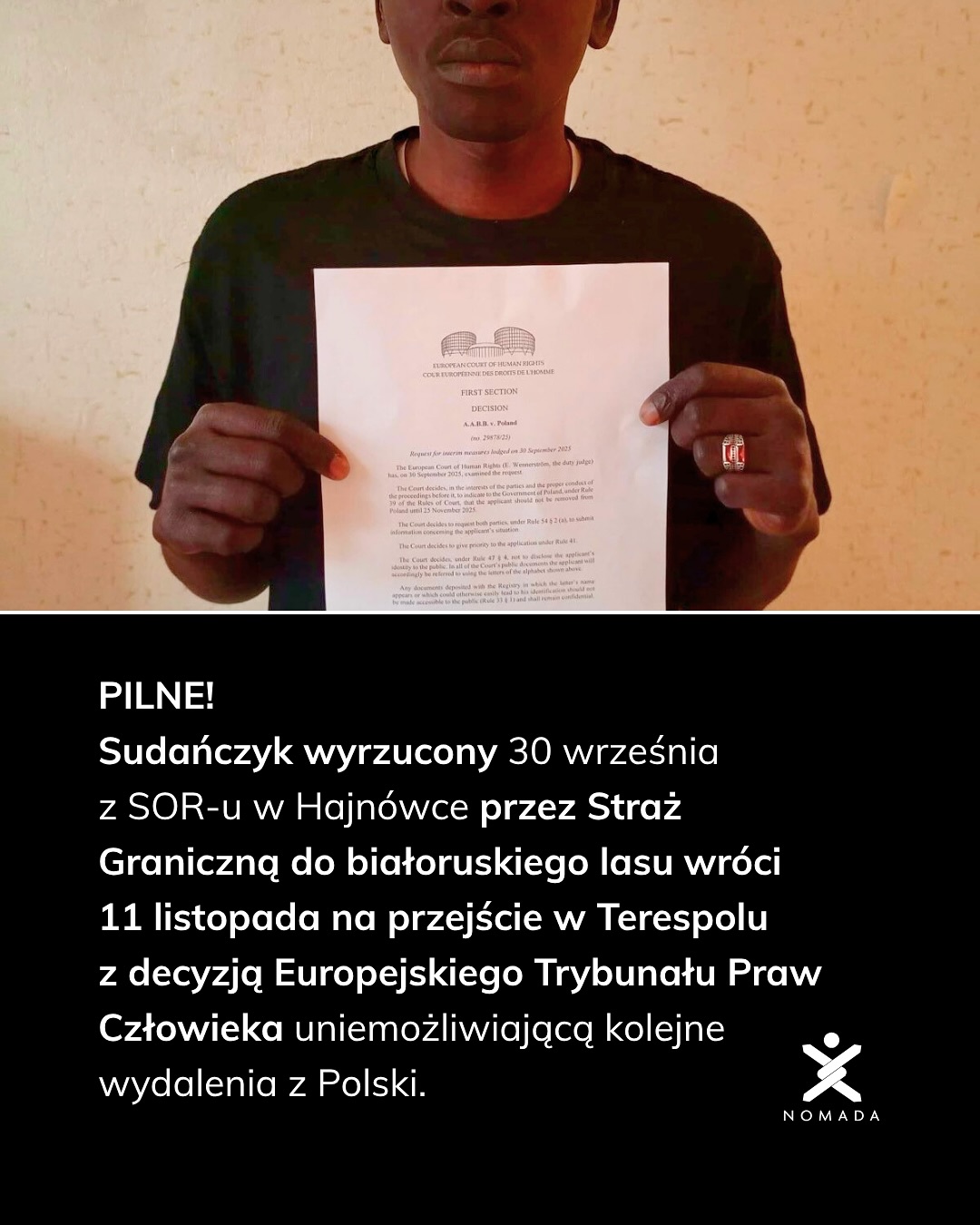 z SOR-u w Hajnówce przez Straż Graniczną do białoruskiego lasu wróci 11 listopada na przejście w Terespolu z decyzją Europejskiego Trybunału Praw Człowieka uniemożliwiającą kolejne wydalenia z Polski.