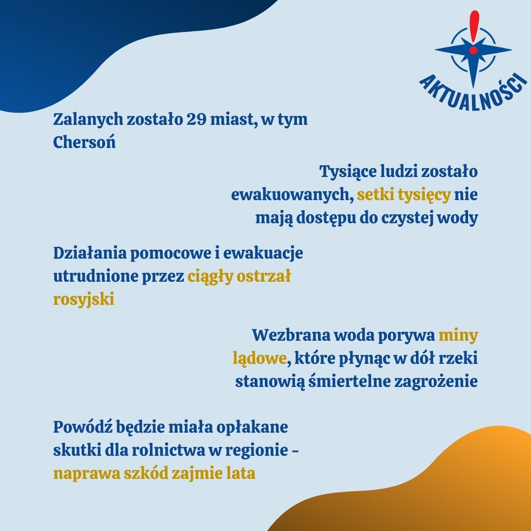 Ukraińskie służby podają, że ewakuowane z terenów objętych powodzią zostały tysiące osób, a setki tysięcy nie mają dostępu do bezpiecznej wody pitnej. Mieszkańcy miast powyżej przerwanej tamy, którzy czerpali wodę z wielkiego zbiornika, dostali nakaz jej oszczędzania.