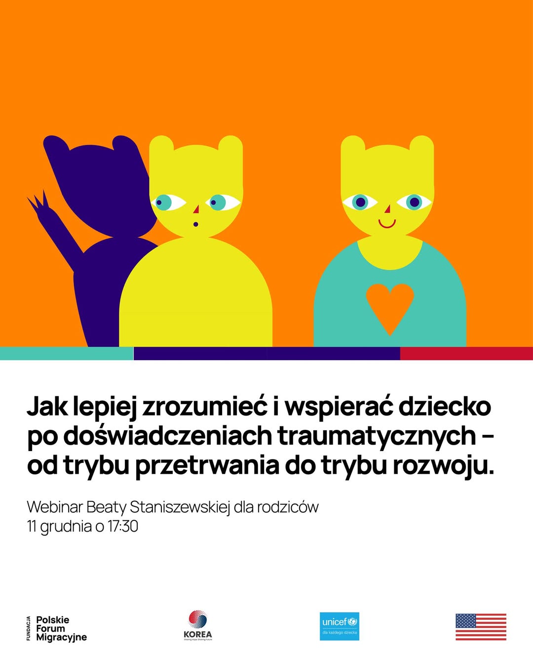 Webinar odbywa się w ramach projektu Integrated support program for refugee families in the Mazowieckie Voivodeship realizowanego przez Fundację Polskie Forum Migracyjne w partnerstwie z Funduszem Narodów Zjednoczonych na Rzecz Dzieci (UNICEF) przy wsparciu Biura ds. Ludności, Uchodźców i Migracji (PRM) Departamentu Stanu Stanów Zjednoczonych i rządu Republiki Korei.