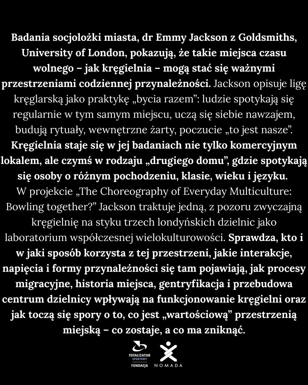 Badania socjolożki miasta, dr Emmy Jackson z Goldsmiths, University of London, pokazują, że takie miejsca do spędzania czasu wolnego – jak kręgielnia – mogą stać się przestrzeniami codziennej przynależności. Liga kręglarska to w jej ujęciu praktyka „bycia razem”: powtarzalne spotkania, rytuały, wewnętrzne żarty, poczucie „to jest nasze”. W projekcie „The Choreography of Everyday Multiculture: Bowling together?” kręgielnia staje się laboratorium wielokulturowości, w którym widać, jak ludzie negocjują wspólne miejsce do życia.