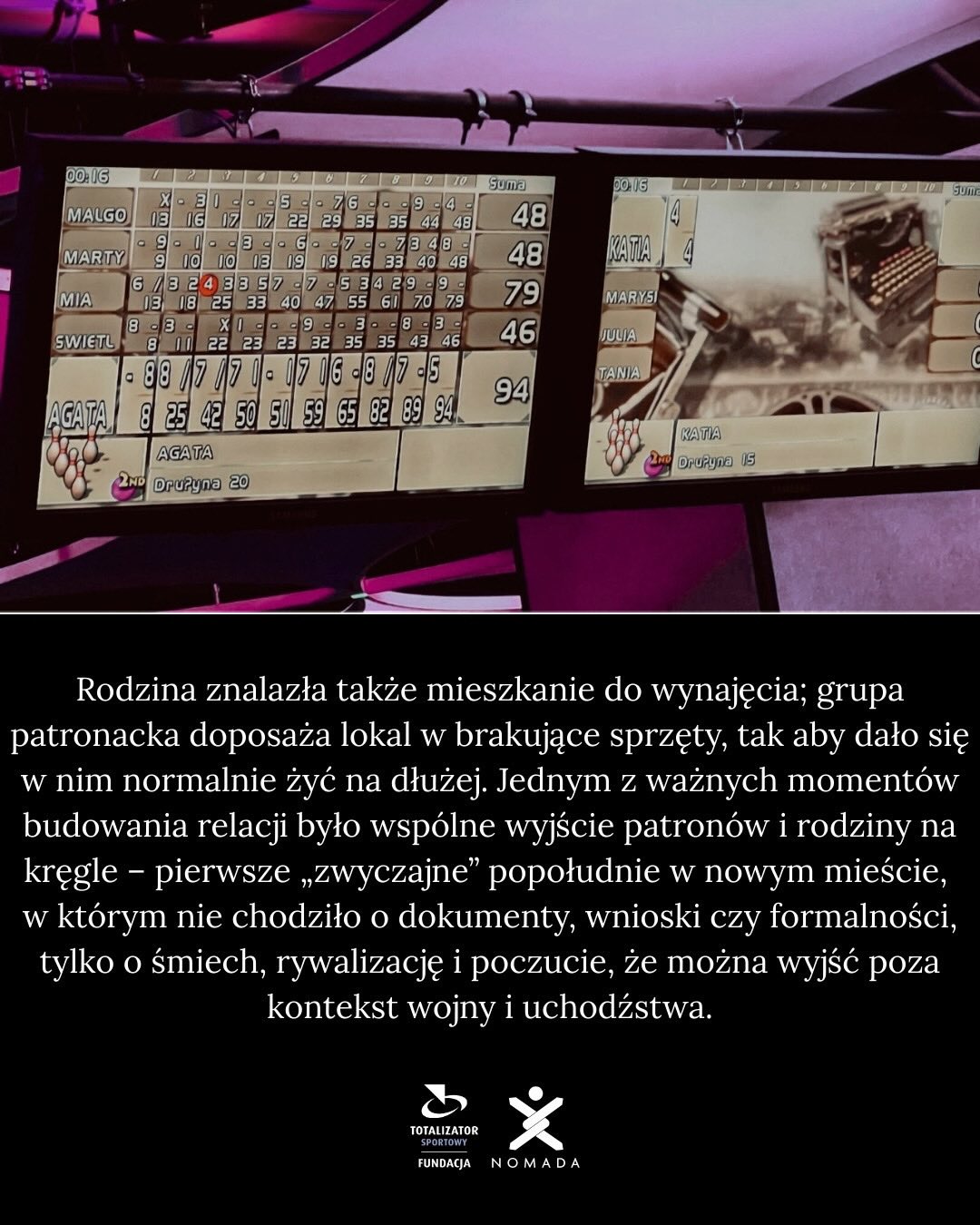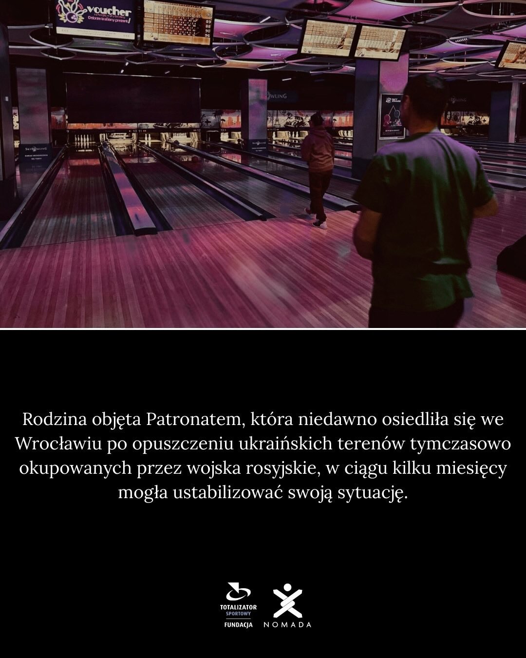 Solidarność w Patronacie Społecznym nie dzieje się na poziomie haseł, tylko decyzji: kto pójdzie z rodziną do urzędu, pomoże znaleźć mieszkanie, ogarnąć szkołę i lekarza. Jedna z rodzin, które uciekły z ukraińskich terenów tymczasowo okupowanych przez wojska rosyjskie, w ciągu kilku miesięcy ustabilizowała sytuację: jest praca na pełen etat, szkoła dla nastolatków, specjalistyczne konsultacje medyczne i pierwsze własne mieszkanie we Wrocławiu. Ważnym momentem budowania tej relacji było wspólne wyjście na kręgle – pierwsze „zwyczajne” popołudnie w nowym mieście, poza kontekstem wojny i uchodźstwa.