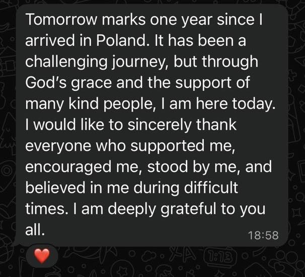 💖 Taką wiadomość dostaliśmy wczoraj od Ilyasa z Somalii. Dziś mija rok, od kiedy Ilyasowi udało się w końcu przekroczyć polską granicę i złożyć wniosek o ochronę międzynarodową. Za nim trudna droga. Przed nim również — bo system nie jest sprzymierzeńcem uchodźców. Ale jak ma się wokół siebie ludzi, którzy trzymają za ciebie kciuki jest dużo łatwiej.