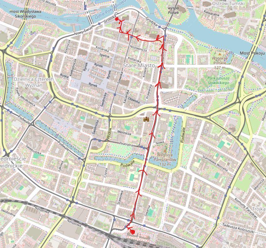 Square in front of the Main Railway Station – Peronowa Street – Kołłątaj Street – Piotra Skargi Street – Blessed Czesław Street – Saint Catherine Street – Piaskowa Street – Bishop Nankier Square – Uniwersytecka Street – Kuźnicza Street – ending point: University Square