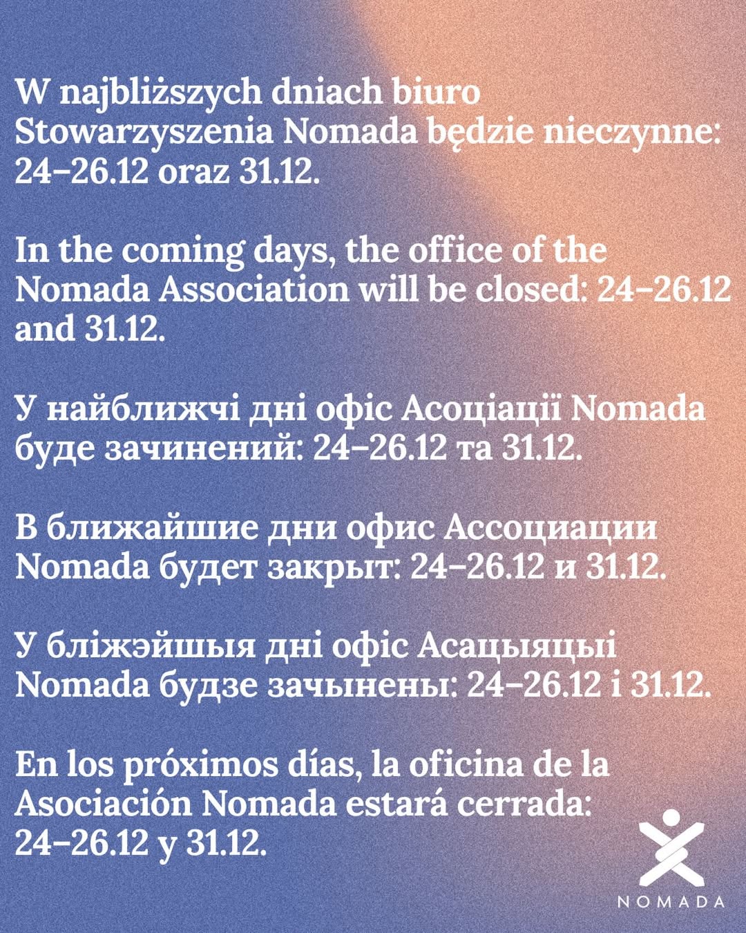 En los próximos días, la oficina de la Asociación Nomada estará cerrada los días 24–26.12 y 31.12.