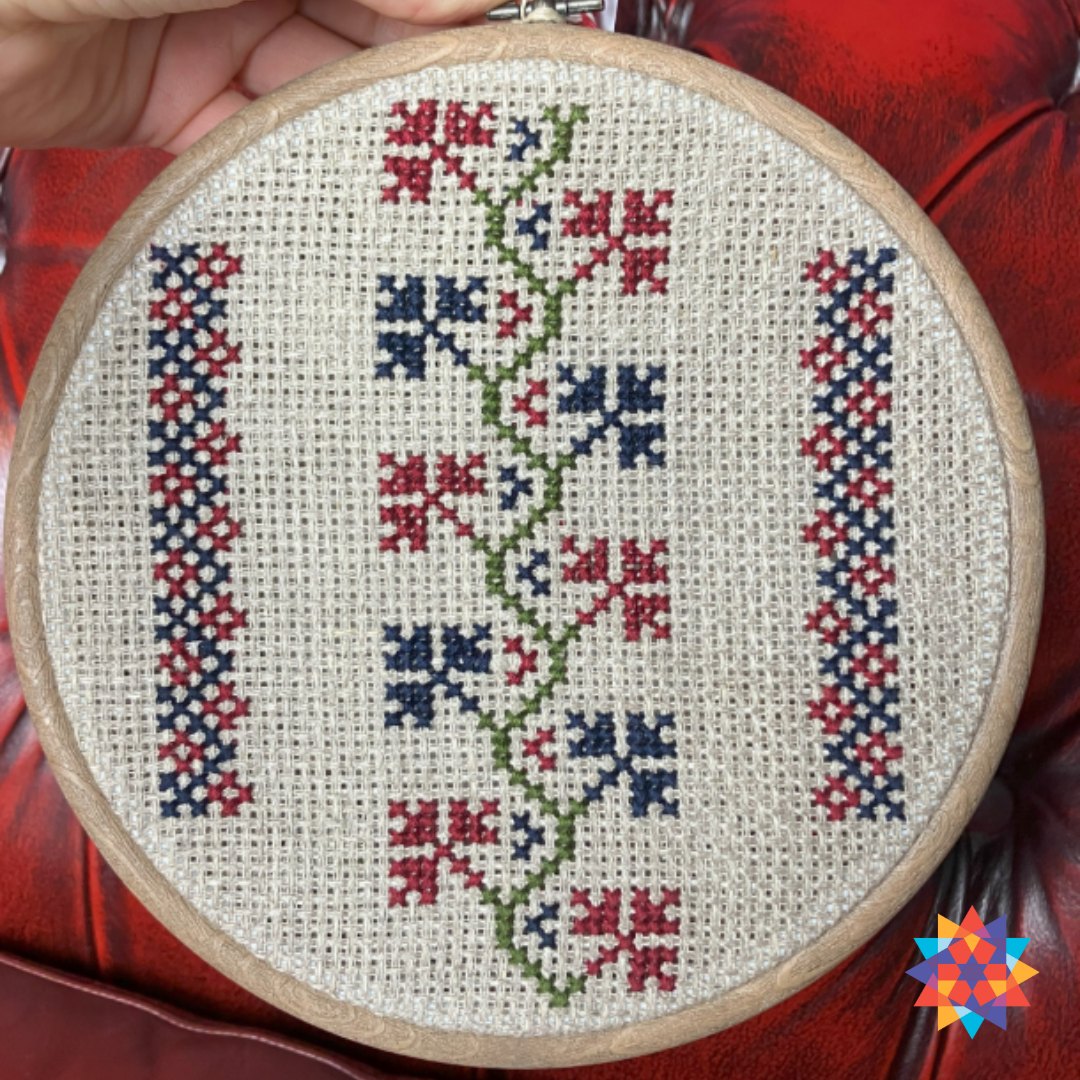 Ręcznie haftowany motyw roślinny wykonany haftem krzyżykowym – idealny do salonu, korytarza, domowego biura czy pokoju dziecka.