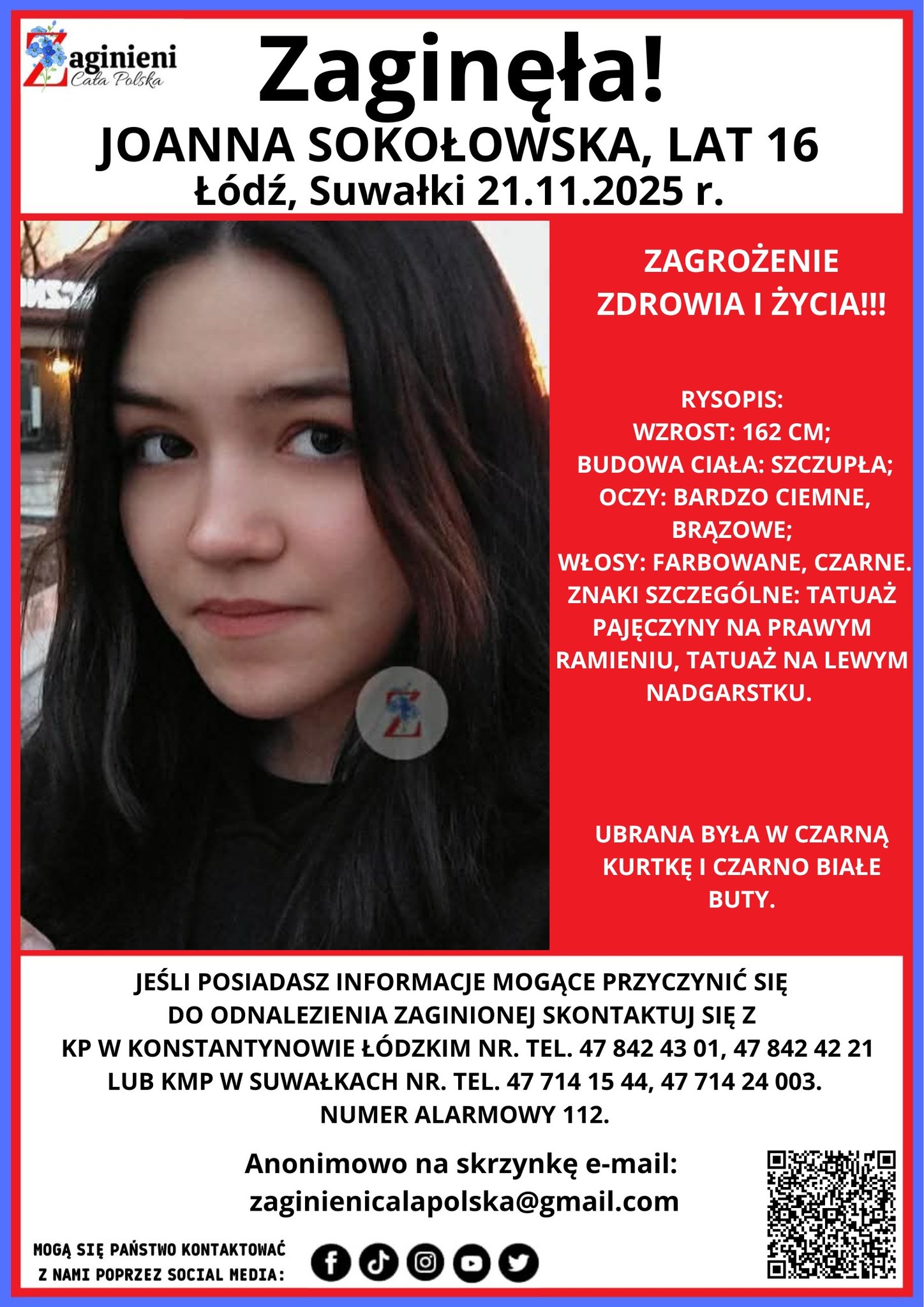 Joanna mieszka w Łodzi. Ostatni raz widziana była 21 listopada 2025 roku w Suwałkach. Od tamtej pory nie powróciła do miejsca zamieszkania oraz nie nawiązała kontaktu z bliskimi.