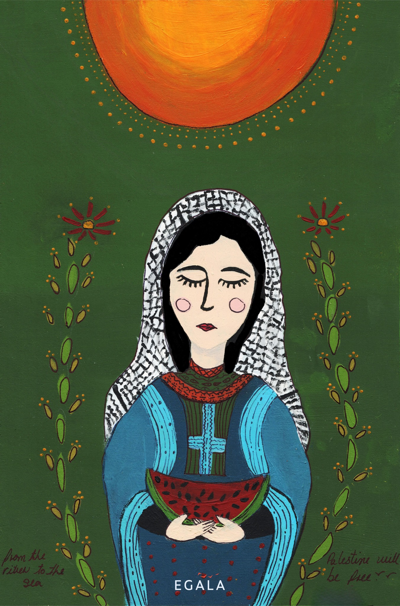 🖌️ Dziś przedstawiamy Wam pracę Mairy* „Kobieta z arbuzem: Palestine will be free”. Maira nie pochodzi z Palestyny, Jej praca jest manifestem niezgody na cierpienie ludzi i symbolem szukania nadziei w każdej sytuacji.